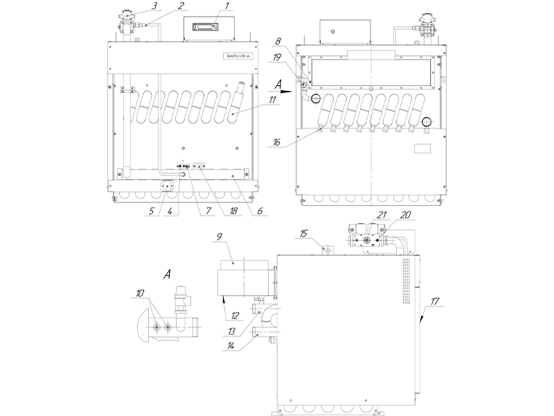 12. Место отбора проб уходящих газов 13. Патрубки отопления (подача) 14. Патрубки отопления (обратка) 15. Транспортировочные проушины 16. Сливная пробка 17. Дверка 18. Глазок для контроля пламени 19. Предохранительный клапан 20. Штуцер для замера давления газа 21. Регулятор давления газа . |